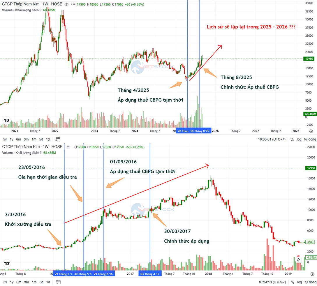 👉 Trong quá khứ, giá NKG đã tăng rất mạnh kể từ thời điểm khởi xướng điều tra đến chính thức áp dụng (từ 2016 đến 2022). Vậy lần này liệu rằng lịch sử có lặp lại chăng?