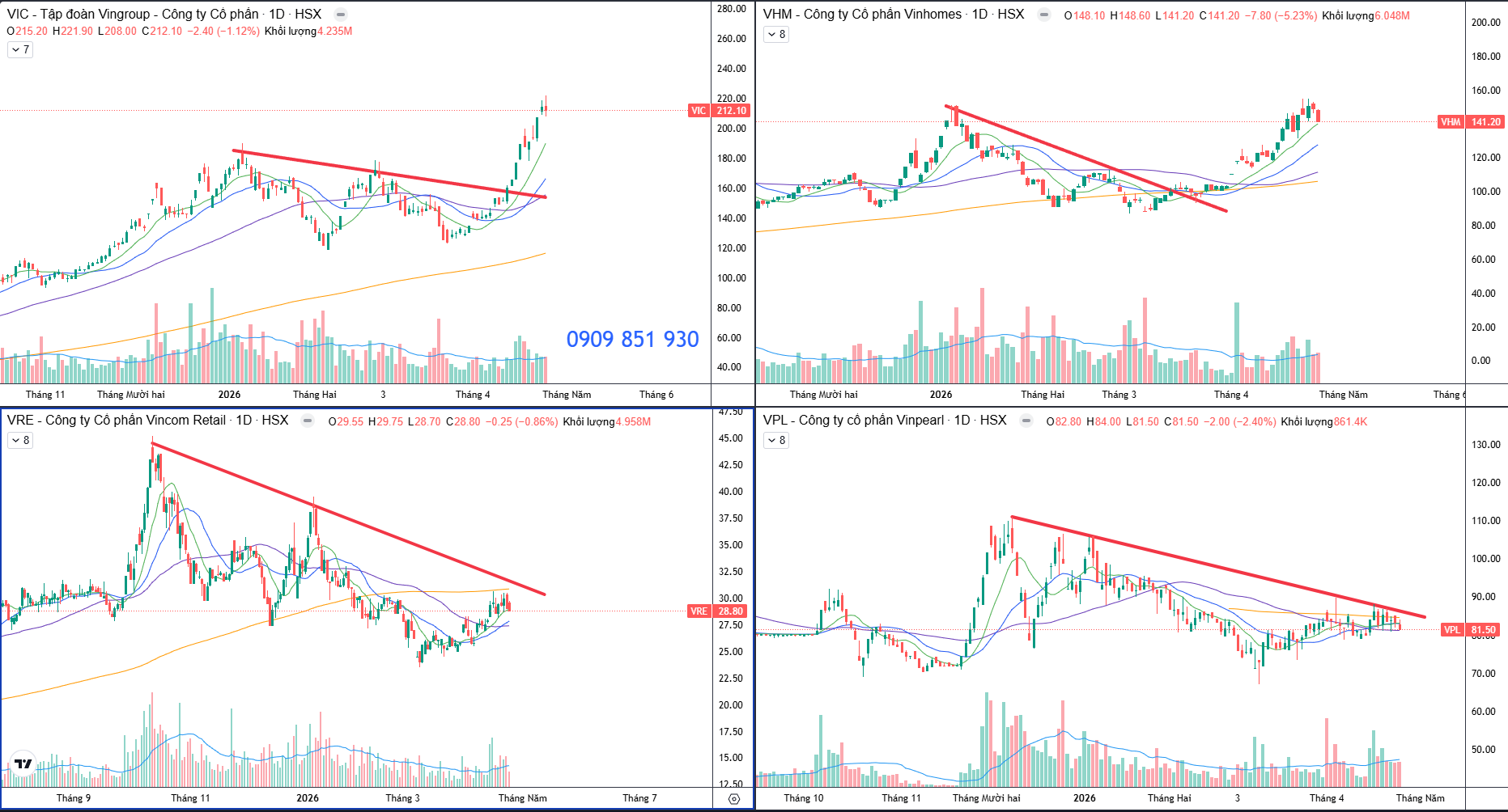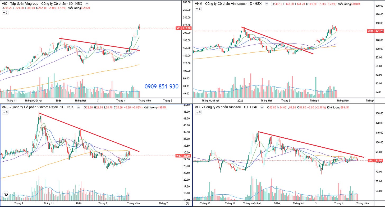 Và nhìn các ngành khác thì sẽ thấy không tăng, nhưng nhìn kĩ thì sẽ xuất hiện những cổ phiếu riêng biệt, mà bản thân nhóm VIN cũng không tăng mạnh đều, chỉ VIC VHM tăng mạnh nhất khi giá thoát khỏi kháng cự downtrend và đặc biệt là nhờ tin KQKD + Chia cổ tức khủng.