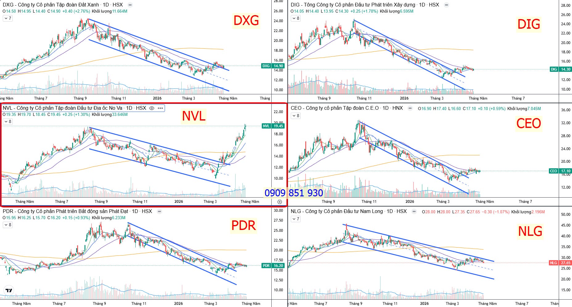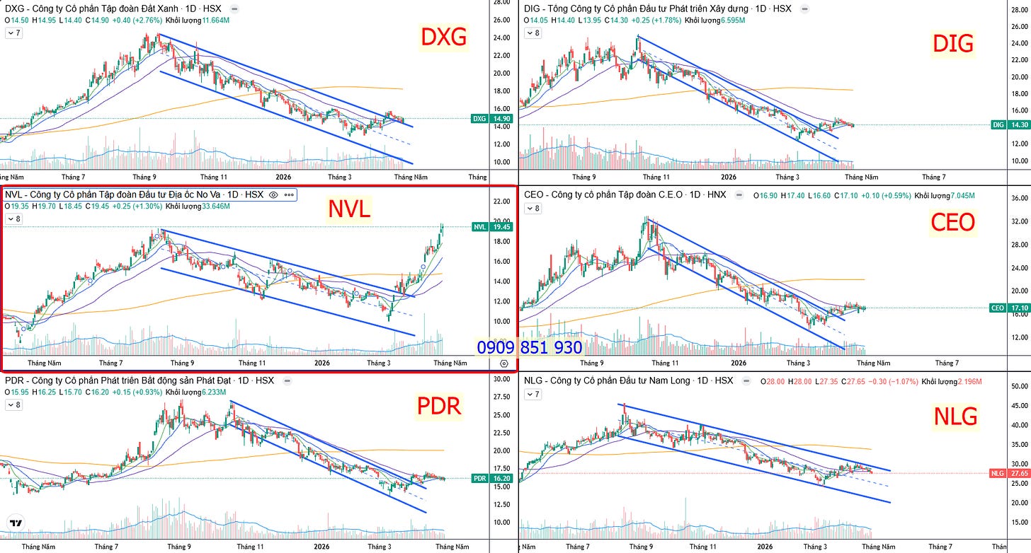 So sánh với 1 vài cổ phiếu trong ngành, thì rõ ràng NVL đã thoát khỏi downtrend và có một nhịp tăng mạnh mẽ và dứt khoát hơn so với các cổ phiếu khác trong ngành.
