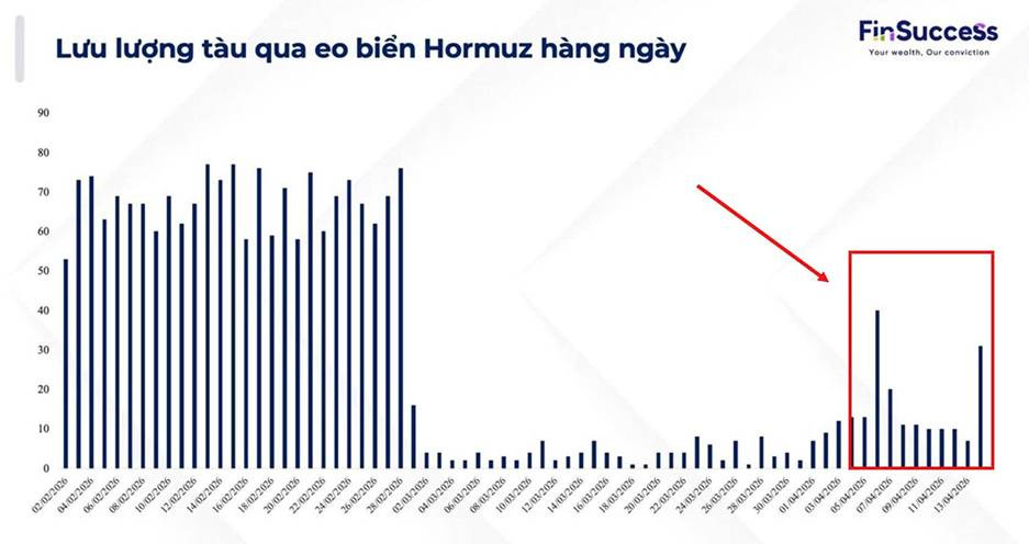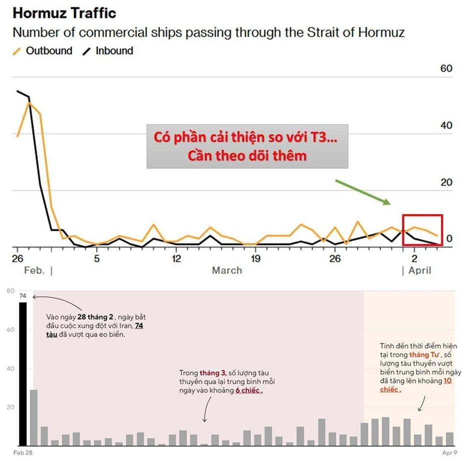 - Kể từ giữa tháng 4, số lượng tàu qua eo biển vẫn rỉ rả, và cải thiện hơn so với thời điểm bắt đầu xung đột. Đến hôm 18/04, có khoảng 10 tàu chở dầu & LPG đã đi qua thành công… Vẫn cần theo dõi tiếp!